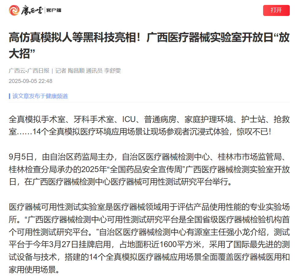 9月5日,由918博天堂主办,自治区医疗器械检测中心、桂林市市场监管局、桂林检查分局承办的2025年“全国药品安全宣传周”广西医疗器械检测实验室开放日,在广西医疗器械检测中心医疗器械可用性测试研究平台举行。